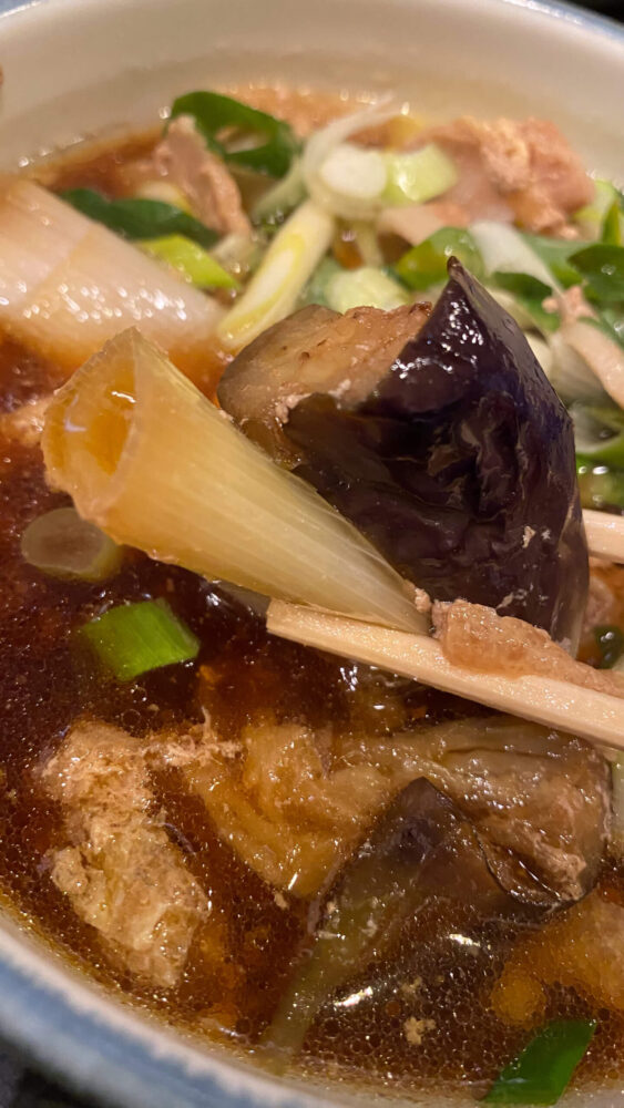 ▲つけ汁の中の茄子やネギも味が染みてめちゃ旨。