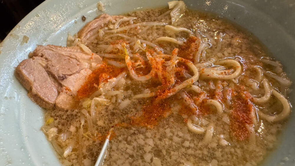 ▲終盤は、卓上の一味唐辛子で辛めに味変。脂っぽさがリセットされるので、ラストスパート!