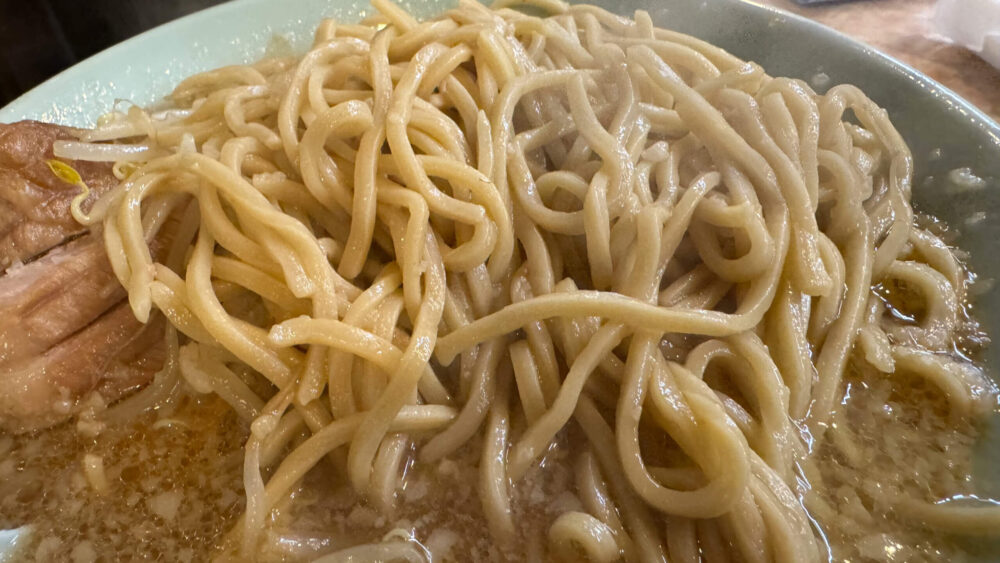 ▲麺は二郎系にしては細め。非乳化スープと背脂を適度にまとうので美味。