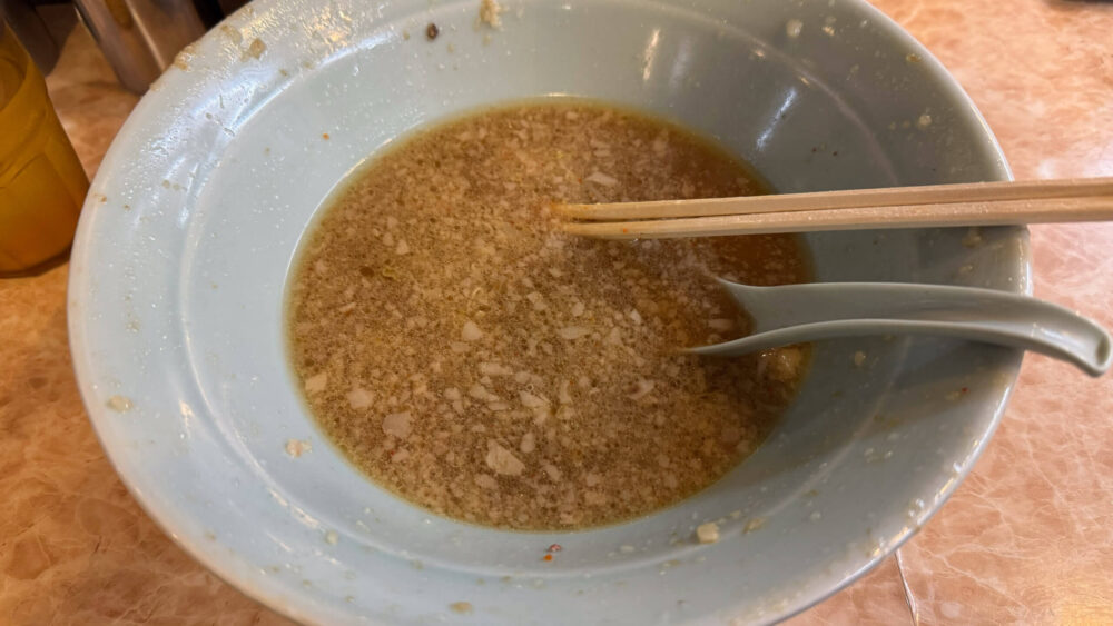 ▲スープは非乳化でチャッチャ系のように背脂プカプカ。味付けはライト寄りなバランス型。豚がしっかりめの味わいなので、ちょうど良い塩梅。