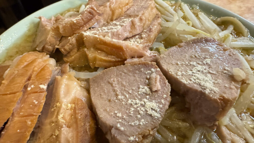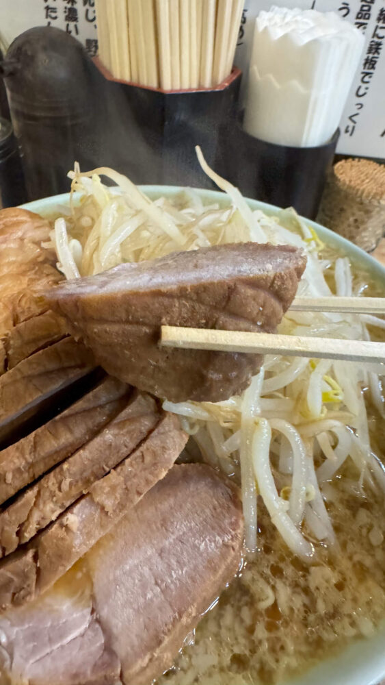 ▲豚の枚数は多いですが、1枚あたりの厚さは二郎系標準なので食べやすい。端豚はややギュチで味染みバッチリ。