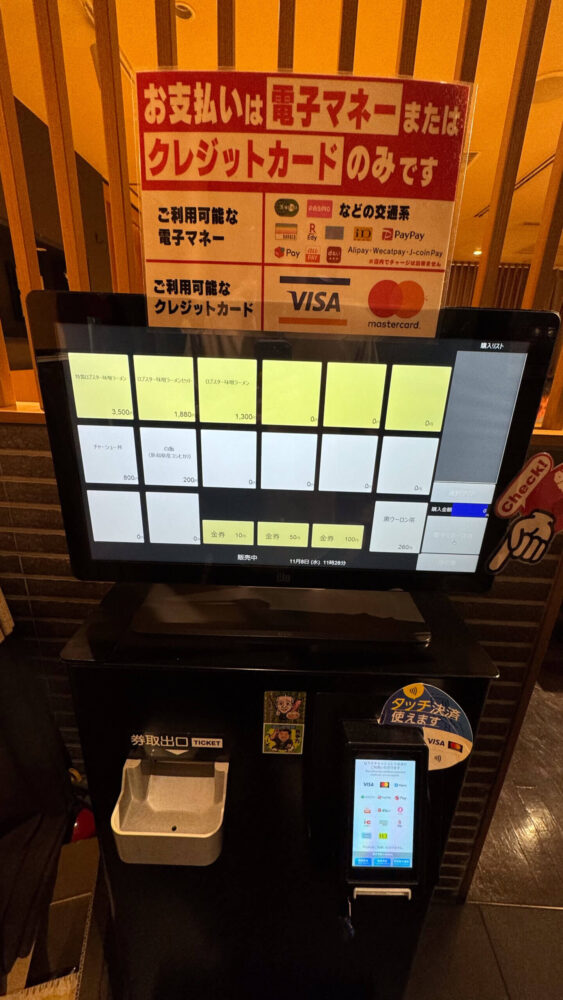 ▲食券機で注文します。現金NGなので電子マネーかクレジットカードでの決済です。