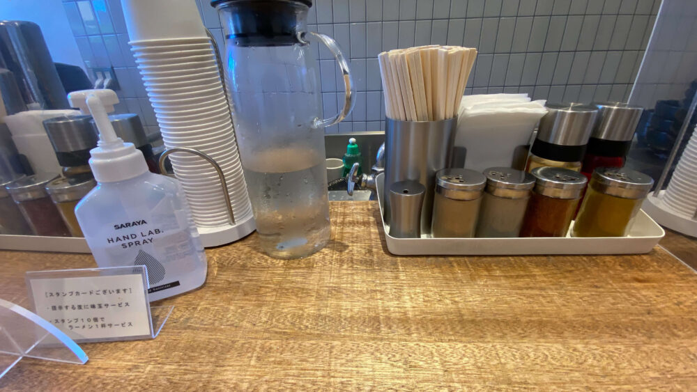▲卓上の様子。ラーメンは辛味噌ラーメン一本ですが、調味料はけっこう豊富で嬉しいです。