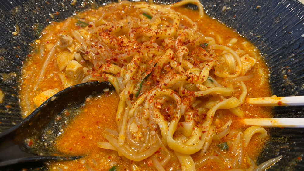 ▲さらに卓上の唐辛子で辛味ブースト。辛さが増しても美味。