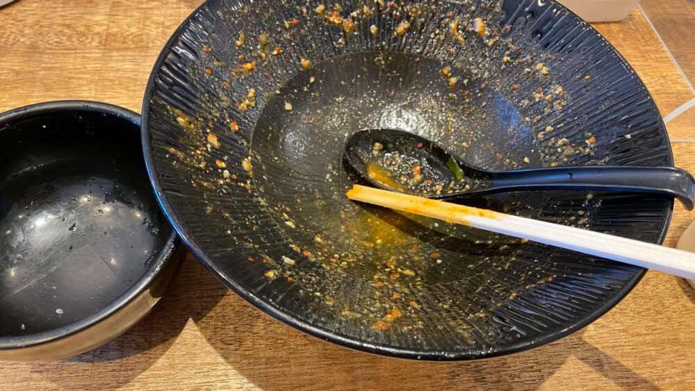 麺大盛で麺量300gもあるので、小ライスもセットで頼めば大食漢の私でもけっこうお腹いっぱいになれるのが嬉しいですね。