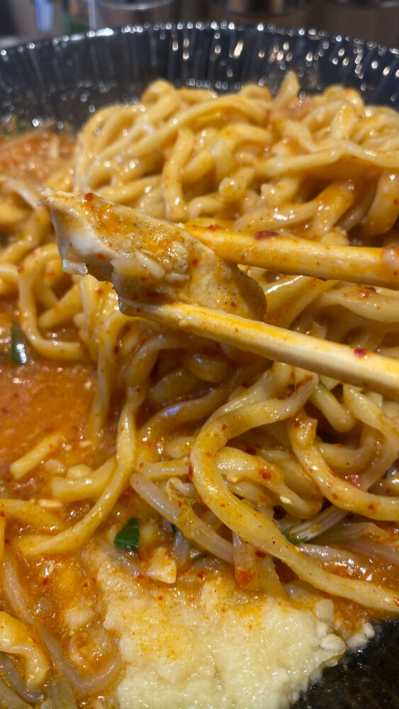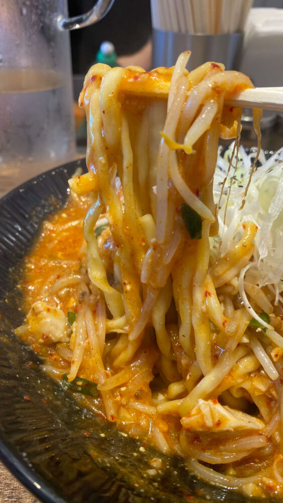 ▲太麺のモチモチ感にこの辛味噌スープが絡みまくって最高。