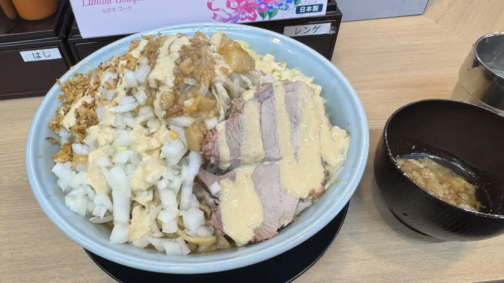 汁なしが着丼!味付き背脂・玉ねぎ・フライドオニオン・ガリマヨで彩り豊かですね!