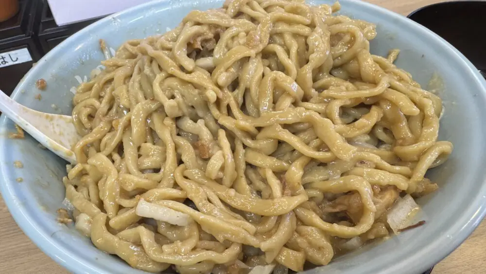 二郎系の他店の汁なしはデフォでブラックペッパーが効いているイメージですが、俺道の汁なしは豚の旨味を効かせている印象。