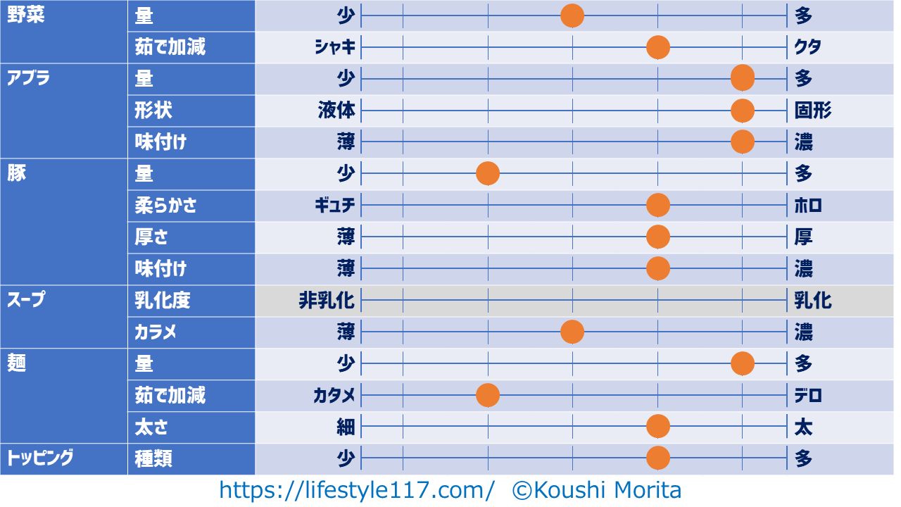汁なしのため、スープの乳化度はグレーアウトしています。