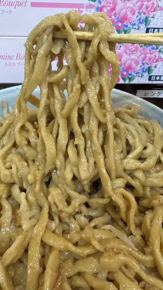 ▲麺はワシワシ食感にタレが絡んでオイリー。豚の旨味が強くて美味。