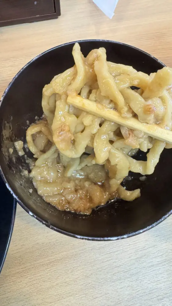 ▲ある程度上物を食べたら、麺とタレをしっかりと混ぜ合わせていきます。いつもはニンニクなど温存しますが、少なめなので全部混ぜていきます。