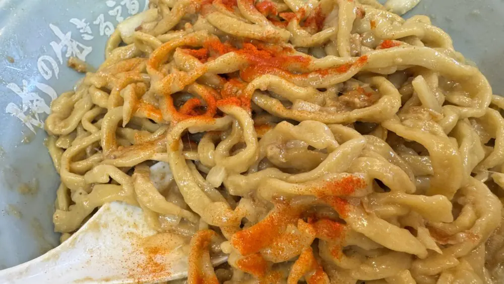 ▲続いて卓上の一味唐辛子で味変。麺量が多いので辛さが良いアクセントになりますね。