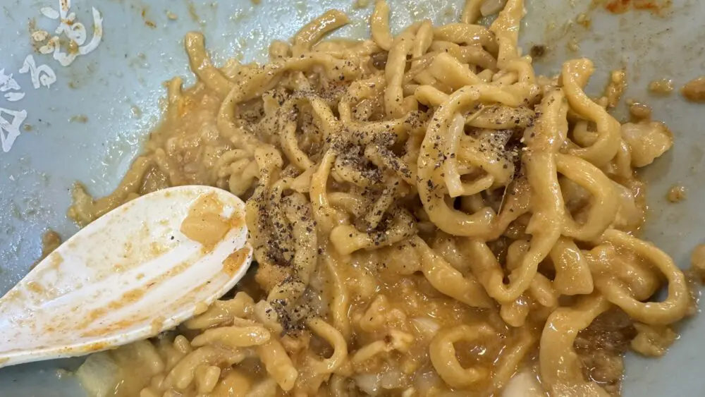 ▲終盤に卓上のブラックペッパーで味変。ピリッと味が引き締まります。これでラストスパート!