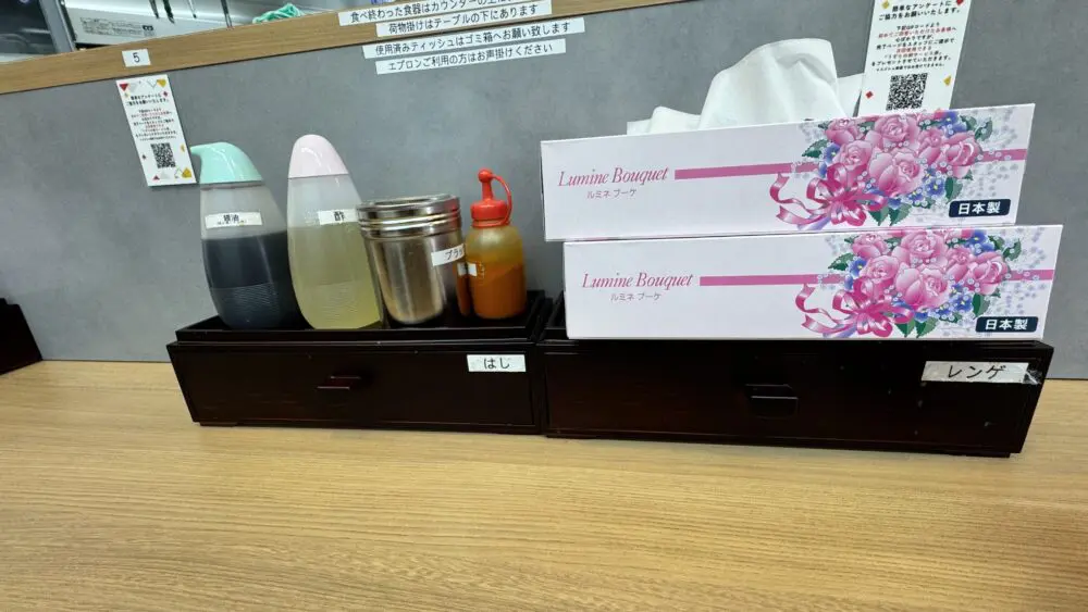 ▲卓上調味料はカエシとお酢、一味唐辛子、ブラックペッパーという基本的な構成。