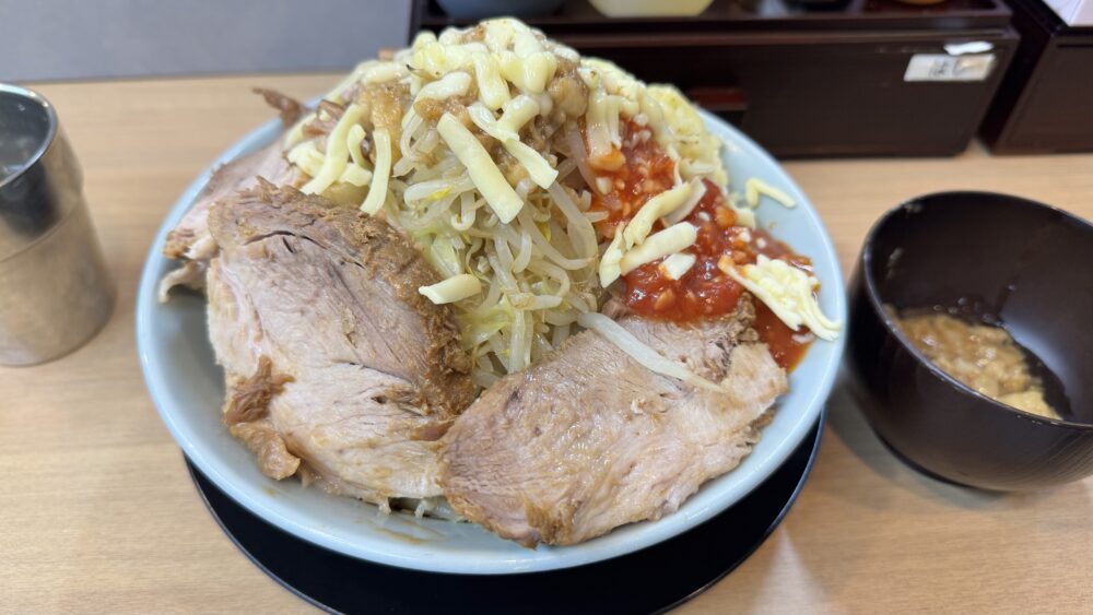 「トマト汁なし(野菜マシにんにく少なめアブラマシ)+チャーシュー4枚+チーズ」を実食!