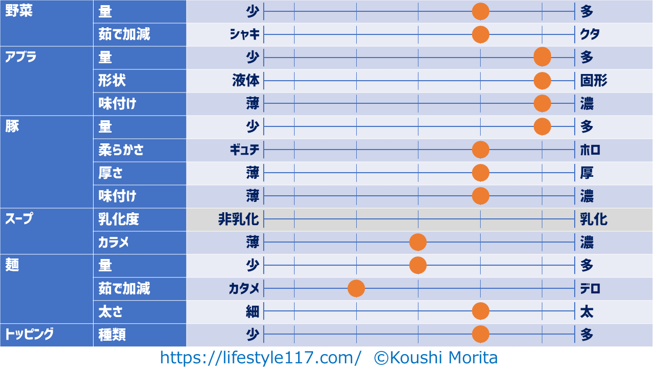汁なしのため、スープの乳化度はグレーアウトしています。