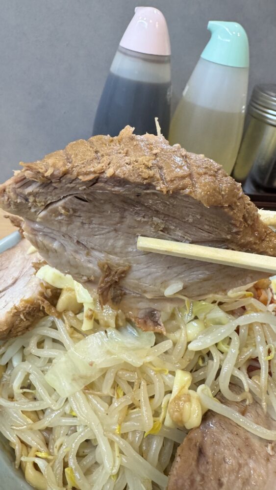 ▲豚は厚くて味染みバッチリ。1枚のボリュームがすごいので、麺を増さなくて正解。