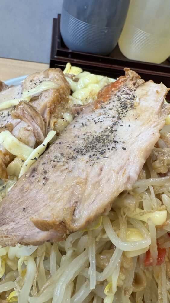 ▲卓上のブラックペッパーで胡椒豚にして楽しみます。胡椒の刺激でよりパンチのある旨さ。
