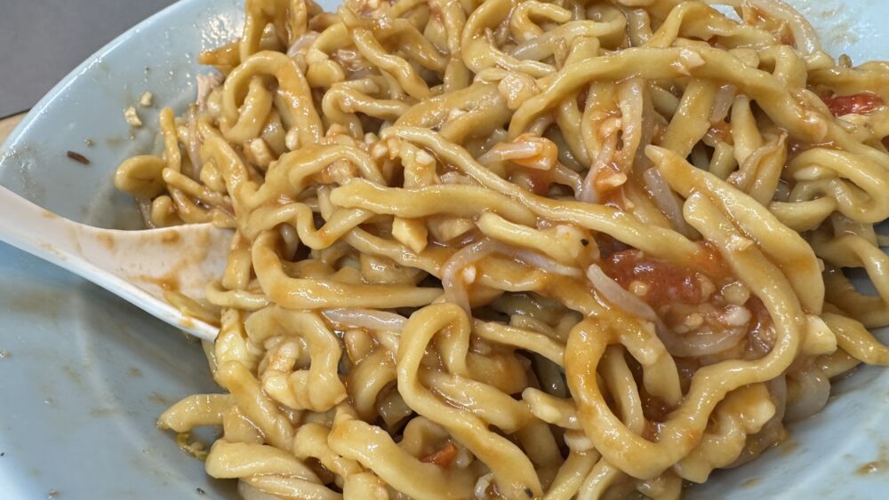 ▲麺はワシワシ食感で、にんにくが効いたトマトソースが絡んでパスタに近いテイストで美味しい。