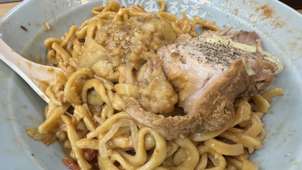 ▲別皿の背脂を投入。終盤のジャンクさが桁違いにアップ。しょっぱ旨な方向へ進化しました。