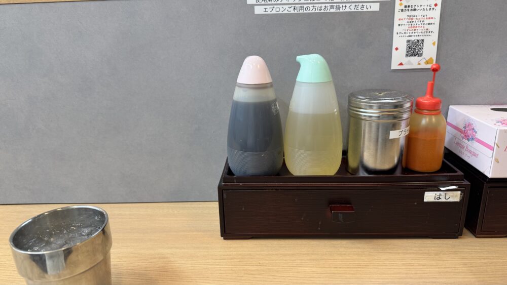▲卓上調味料はカエシとお酢、一味唐辛子、ブラックペッパーという基本的な構成。