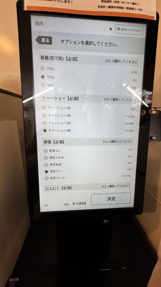 ▲店内のデジタルな券売機で注文します。ただし、現金決済のみ。