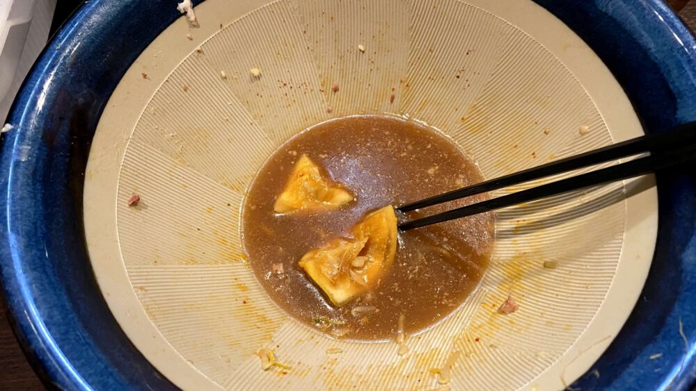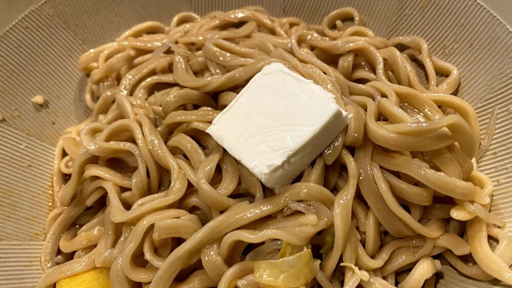底の方はタレが溜まっていて味が濃くなるので、クリームチーズをかじる→麺をすするを繰り返しました。