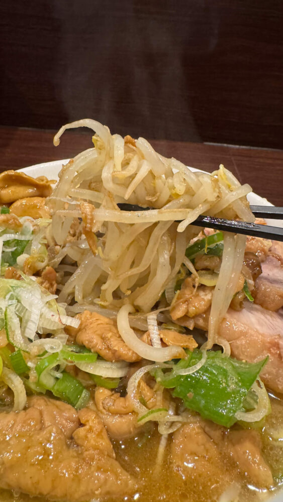 ▲野菜の上にモツとアブラが乗っていて、増していないのに標高はなかなか。