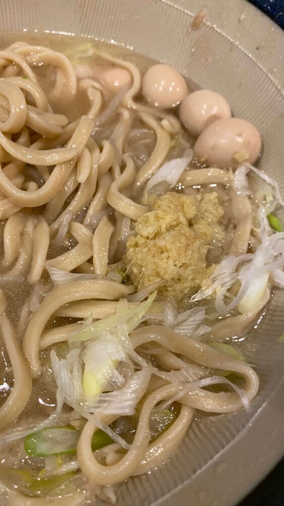 今回はネギ油の塩ラーメン+麺増し600g+生玉子W+生姜+うずらを注文しました!