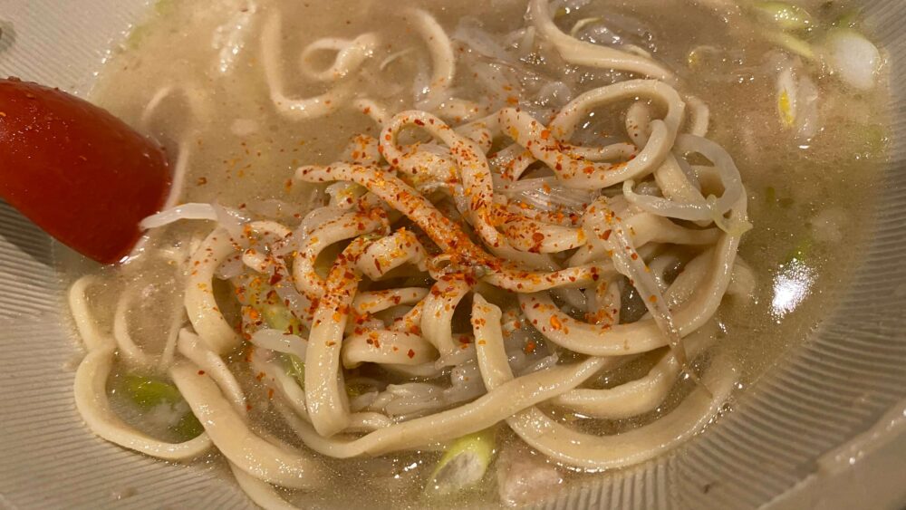 ▲最後は一味で辛味ブースト!完食までラストスパートです。