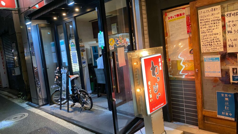 ▲看板は控えめなので、初見だと通り過ぎてしまうかも。居酒屋わっしょいの隣です。