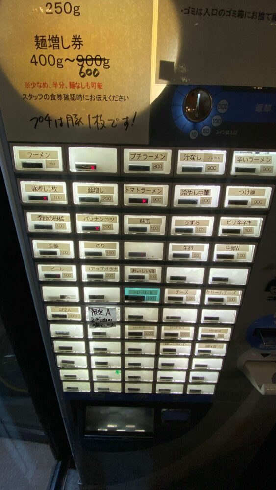 ちなみに、今回は麺増し券を購入したので、400~600gの範囲内で何gにするか聞かれ、最大の600gをお願いしてみました。