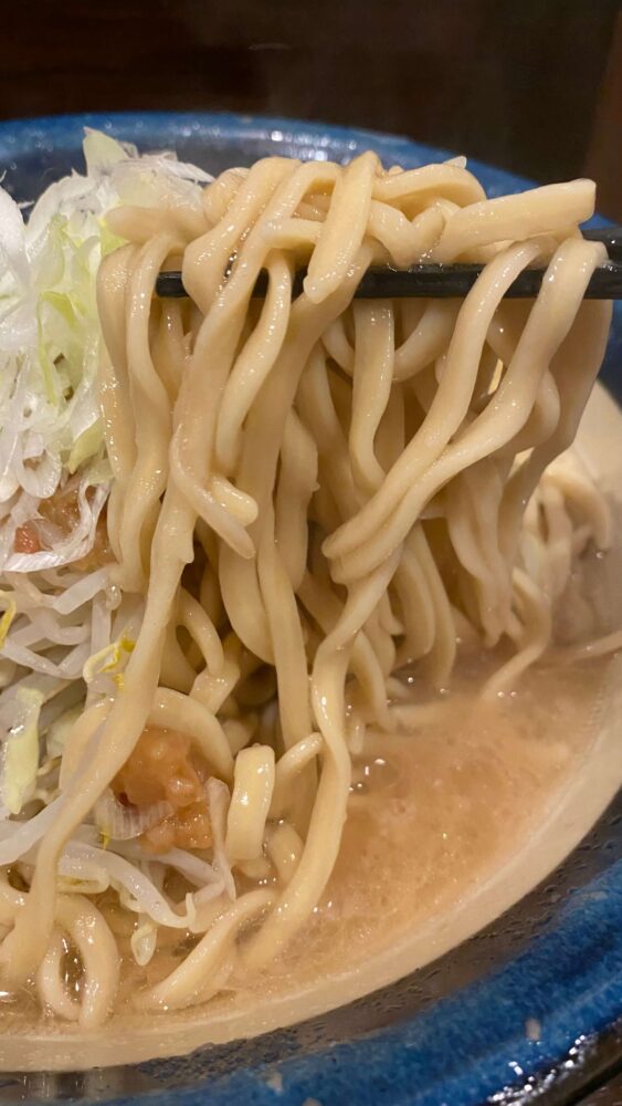 ▲いつもの平打ち気味な中太麺。
