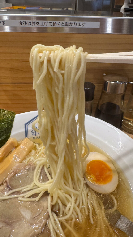 ▲麺は細めでパツっと食感。塩スープがよく絡んで旨い。