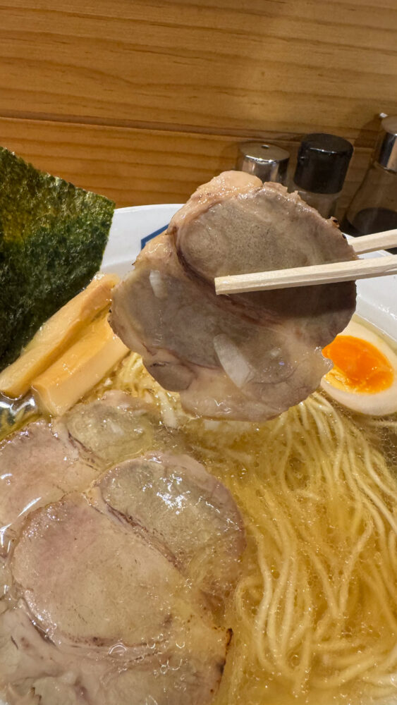 特製真珠が着丼!清湯系で透明感のある塩スープが美味しそう!