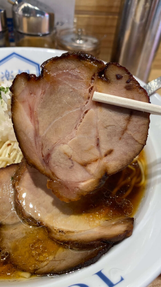 ▲外側をしっかり炙られたチャーシュー。香ばしくて美味。3枚も入っていて嬉しい。