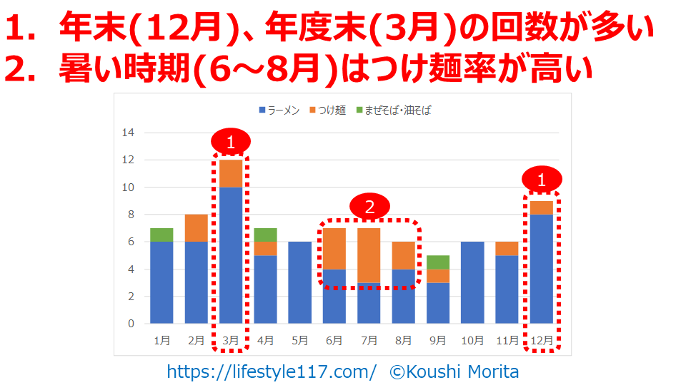 - 暑い時期(6~8月)はつけ麺率が高い。