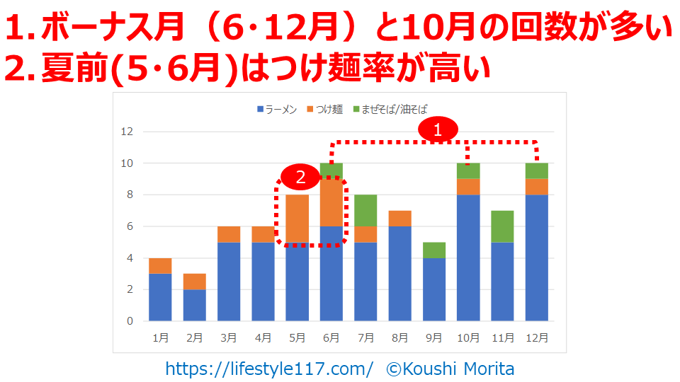 2については、夏前で気温が上がり始めたから、本能的につけ麺を選択したのでしょう。