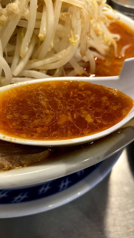 ▲赤いスープはピリ辛ですが、ほんのり豚の旨味とカエシの塩味が利いています。