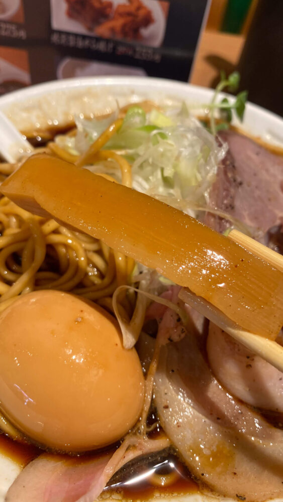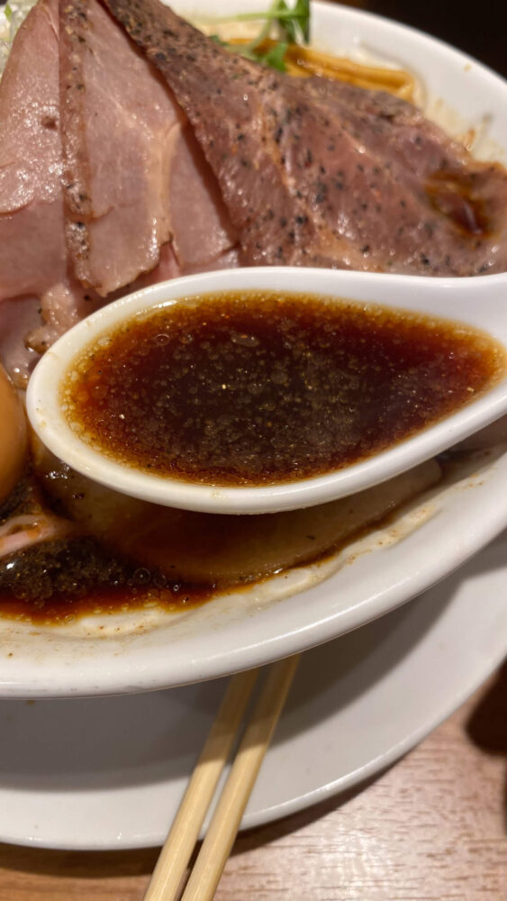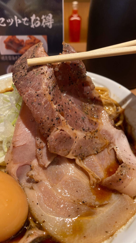 ▲炙りチャーシューは香ばしさとブラックペッパーの刺激でパンチ力強め。いつものレアチャーシューとは別の魅力がありますね。