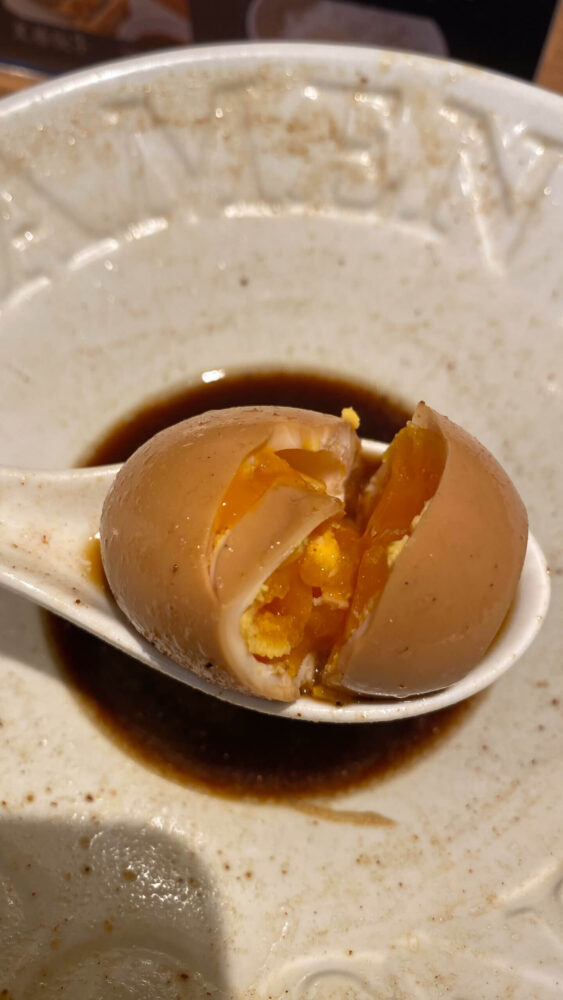 ▲デザート代わりに終盤に煮玉子。しっかり半熟で煮干しスープと合わせて食べると最高です。