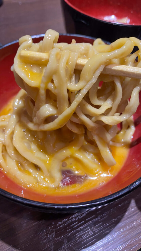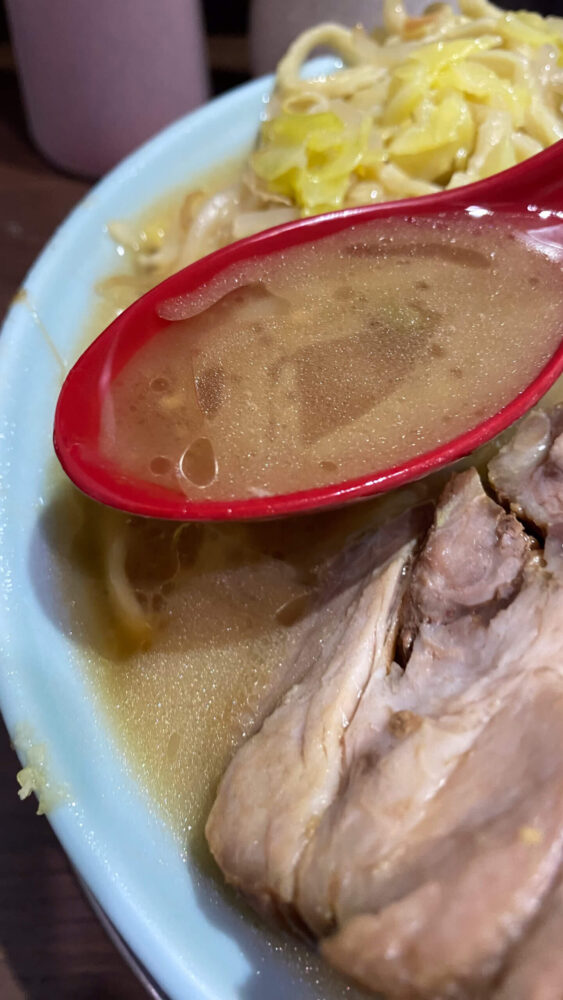 ▲スープはド乳化。意外と甘めで豚の旨味がしっかり味わえます。
