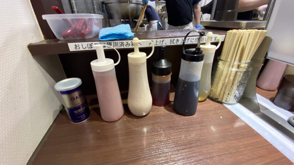 ▲卓上調味料がめちゃくちゃ豊富。胡椒、唐辛子、すりごま、ラー油、醤油、お酢など。