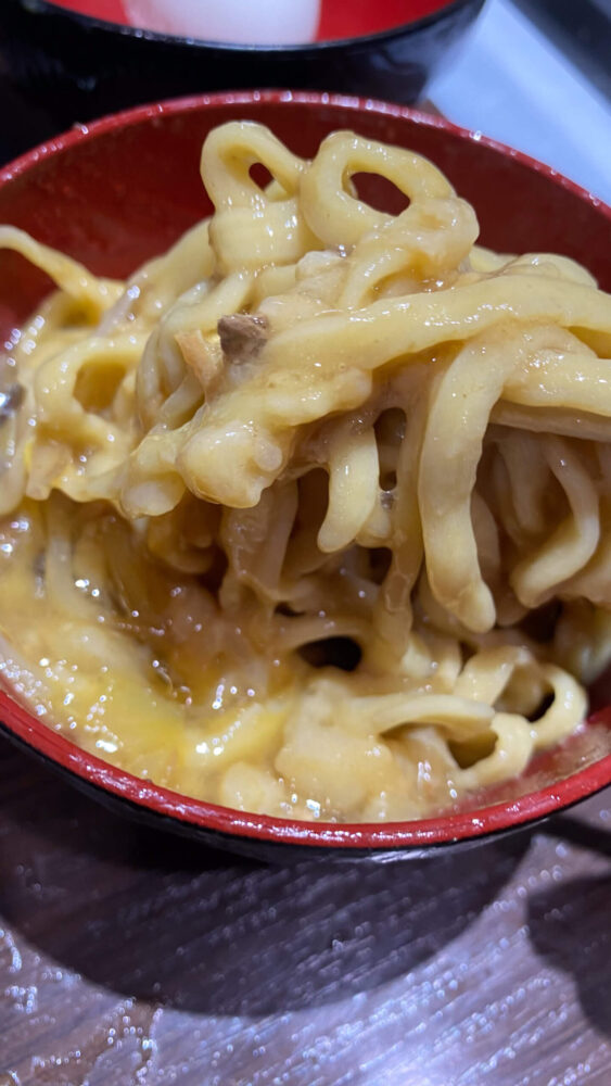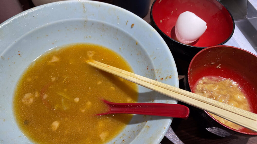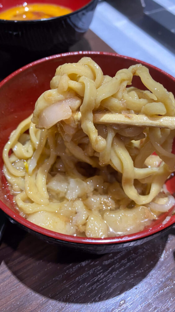 ▲豚は1枚だけ残してしまっていましたが、このタイミングで食べないと完食が難しいと思い気合で食べ進めます。