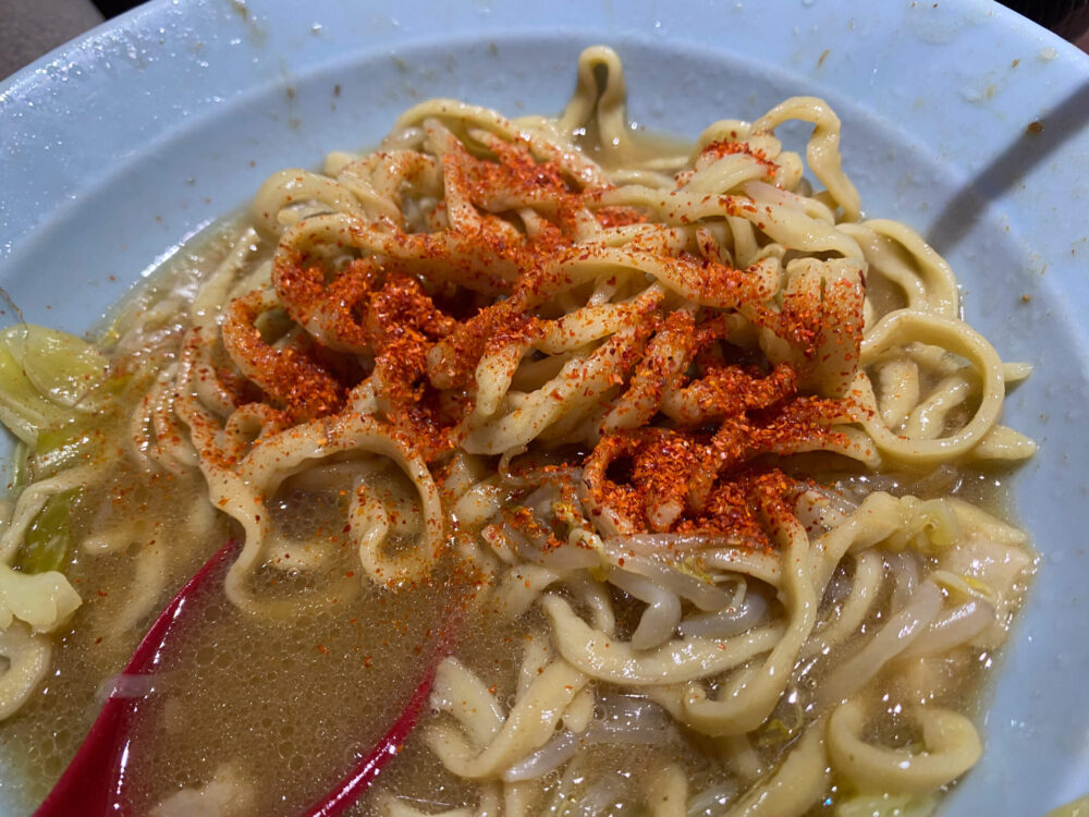 ▲この辺でかなりの満腹感(笑)卓上の唐辛子で辛くして食欲を奮い立たせます。