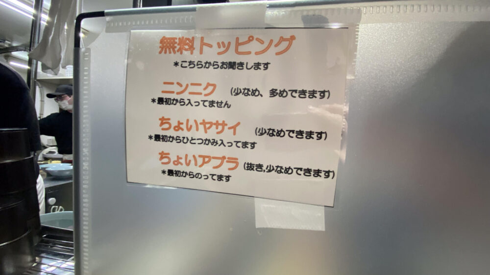 ちなみに、このお店の無料トッピングは以下のとおり。