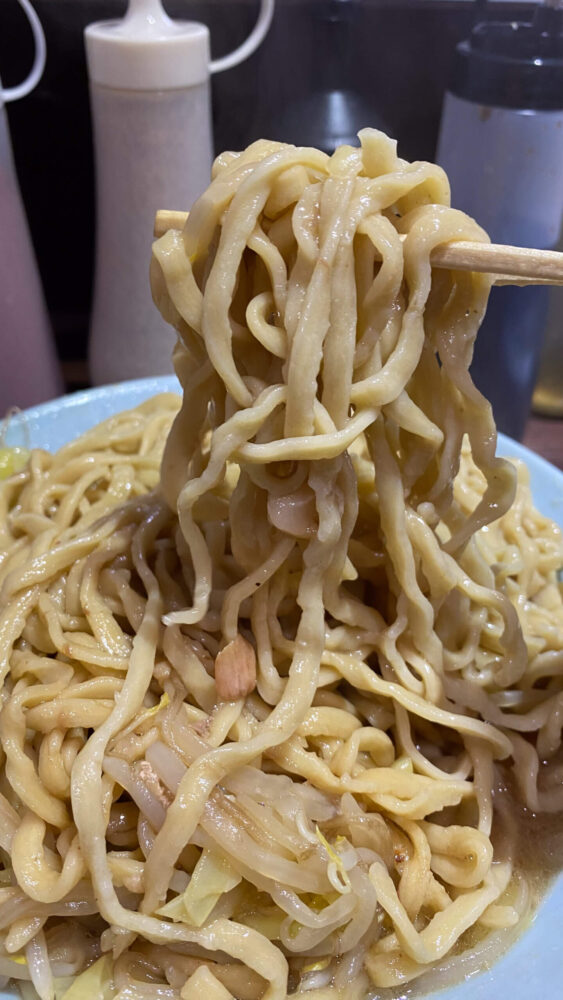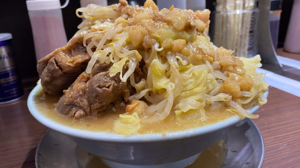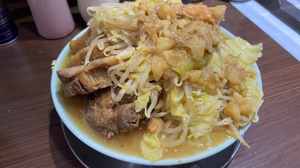「ブタメン普通(ちょいヤサイちょいアブラ)+生卵+ブタカスアブラ」を実食!