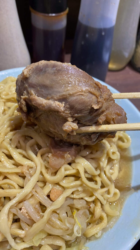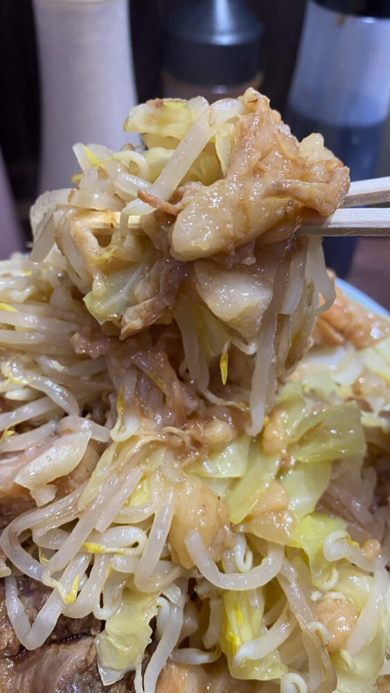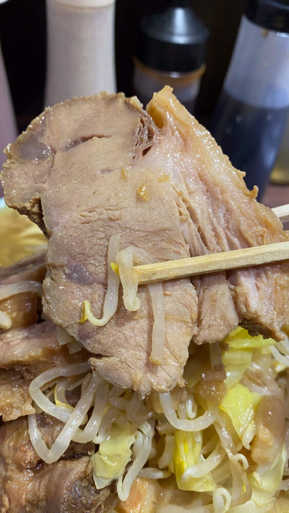 ぶ厚い豚4枚の上に乗る野菜とプルプルな味付きアブラがすさまじく食欲を刺激する一杯!