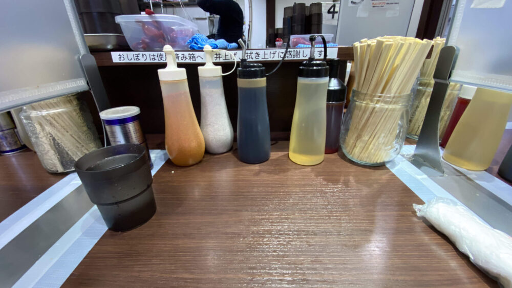 ▲卓上調味料がめちゃくちゃ豊富。胡椒、唐辛子、すりごま、ラー油、醤油、お酢など。