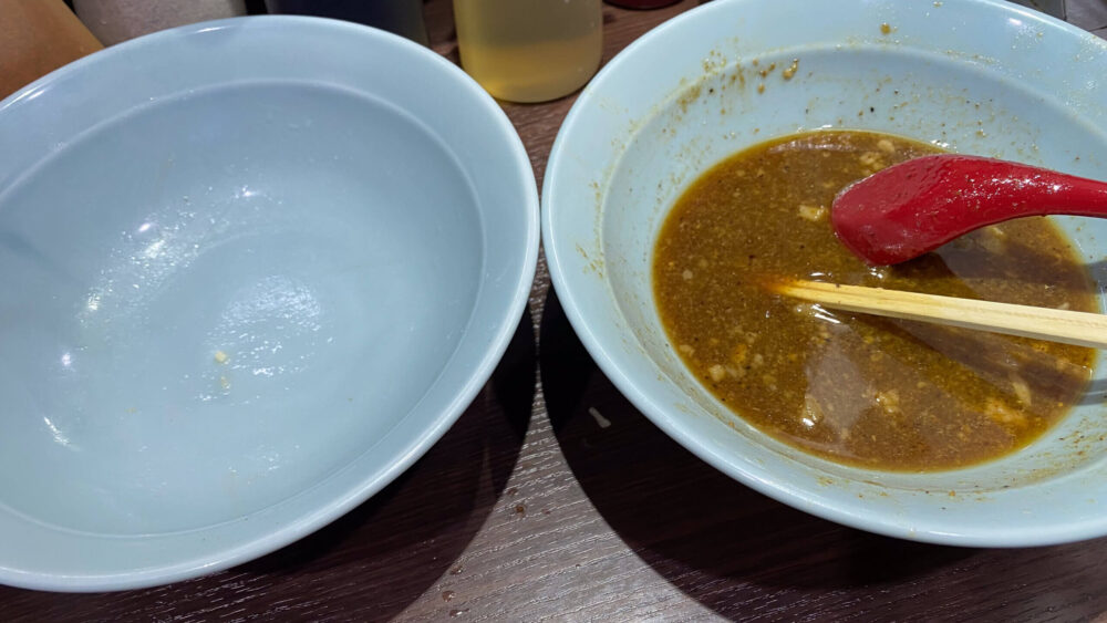 ▲つけ汁の野菜は片側に寄せて盛られているので、横から見ると高さがありますね。